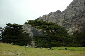 Endlich auf 1218 m Höhe angekommen kann man die überwältigten Schönheit genießen und die vom Wind zerzausten Kiefern klammern sich an den Grashang. |