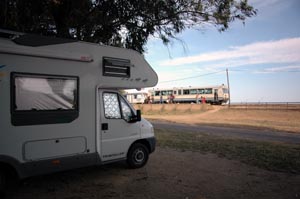 Der Campingplatz zeigte das Ambiente vom Kalten Grund: Eine Bahnschiene mitten durch den Platz, danach das Meer. |